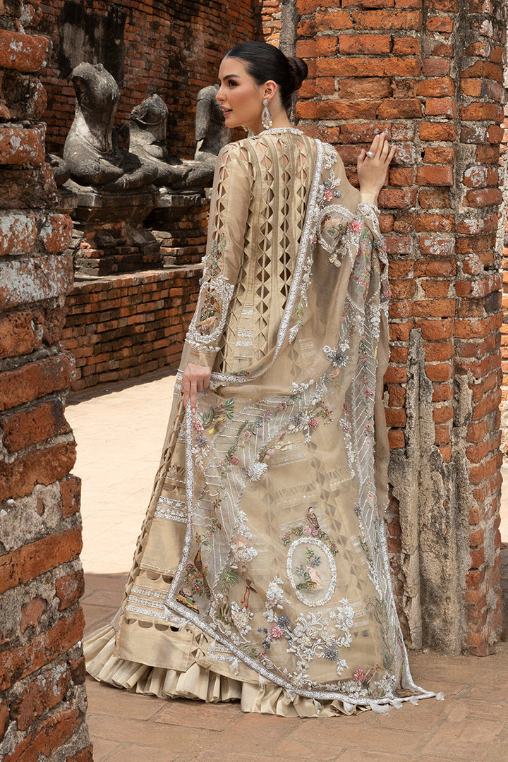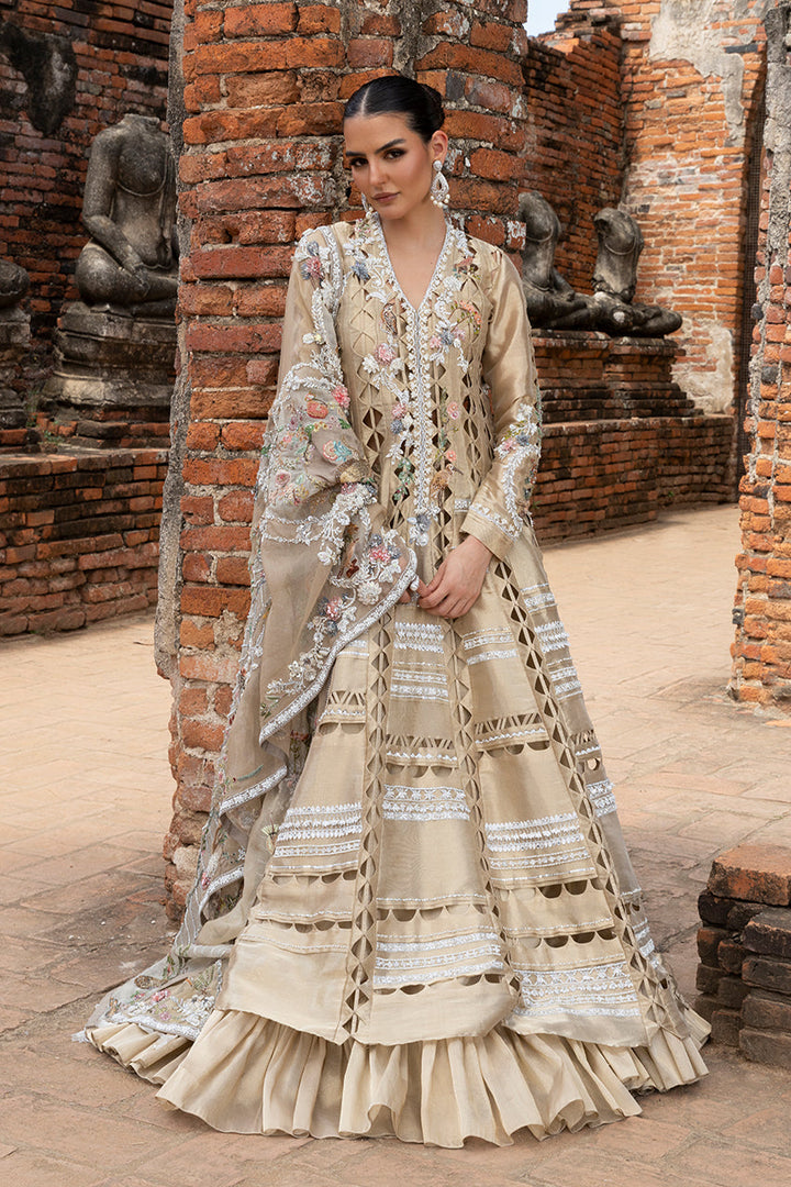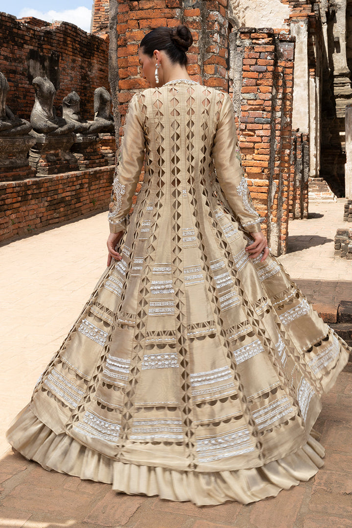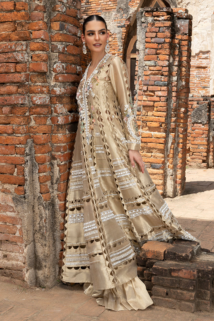 Made to be vision in dull gold, this ensemble bridges tradition and modern poise. Its kalidar in tissue silk is a study in delicate craft cutout panels and pleats forming a textural rhythm, while carefully crafted aari-embroidered floral motifs in resham cascade in vines down the neckline, enlivened by gleaming zardozi, sequins, crystals and beadwork. Similar cutouts and embellished motifs thoughtfully adorn the sleeves, while the kalis gleam with zardozi, crystals and beadwork, interspaced with dimensional cutouts in a lyrical asymmetry. The metallic silk lehnga beneath adds volume to the silhouette, softened by a ruffled edge, while the blouse in metallic silk gleams with beaded crystal straps. Draped with a sheer organza dupatta ornate with shimmering floral and baroque motifs, crafted in aari, zardozi, and dimensional flourishes the look is heirloom-worthy, luminous in detail and, imbued with elegance for special festivities.