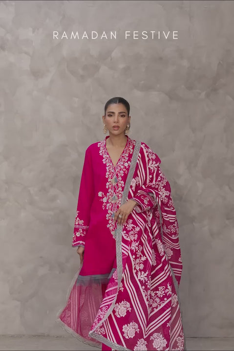 Delivery in 2-3 WeeksA vivid hot pink, balanced with thoughtful detail. The cotton lawn kameez falls to the knee, its neckline traced with floral tendrils. Layers of screen prints and threadwork bring the blooms to life, with soft handmade tassels adding another layer of interest. The cuffs feature the same pattern, edged with delicate cutwork scallops. A matching cotton lawn shalwar mirrors the detailing at its embellished hems. Completing the set, a tonal organza dupatta pairs floral screen prints with an embroidered organza border, for a bright yet composed look.