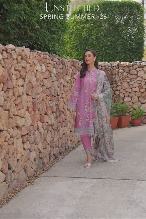 French floral sophistication, rendered on purplish pink premium lawn. The shirt fabric is embroidered with soft bouquets, framed with delicate trims for the neckline and embroidered organza borders for the cuffs and hem. Paired with matching bottoms, that come with an embroidered organza insert, and a printed pure silk dupatta, this suit is light, graceful, and easy to carry.
