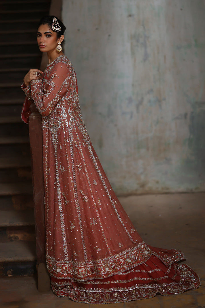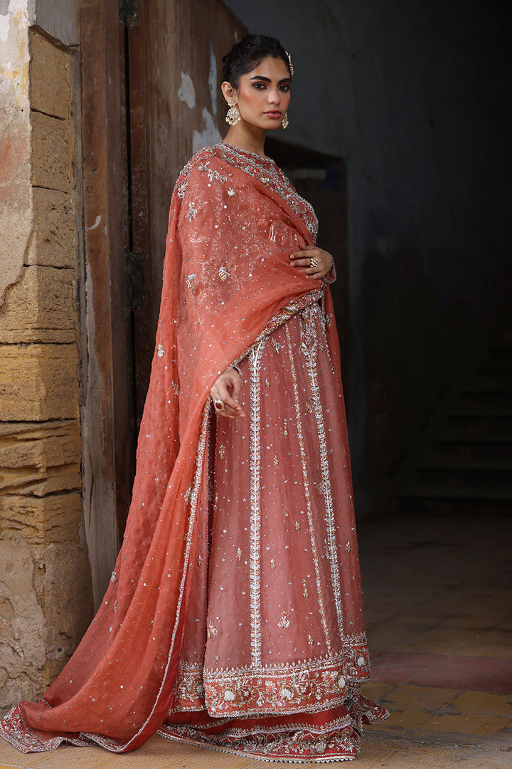 It is paired with a pure organza, coral pink, farshi gharara with intricate zardozi and gota work. It can be worn with a pure organza light coral pink dupatta with gold and silver zardozi work finished with a silver lace.