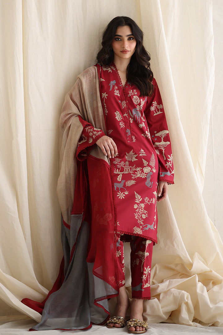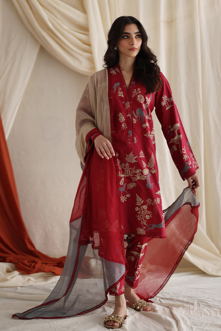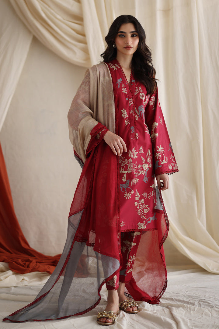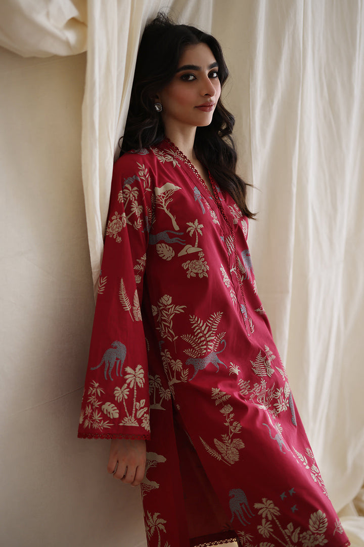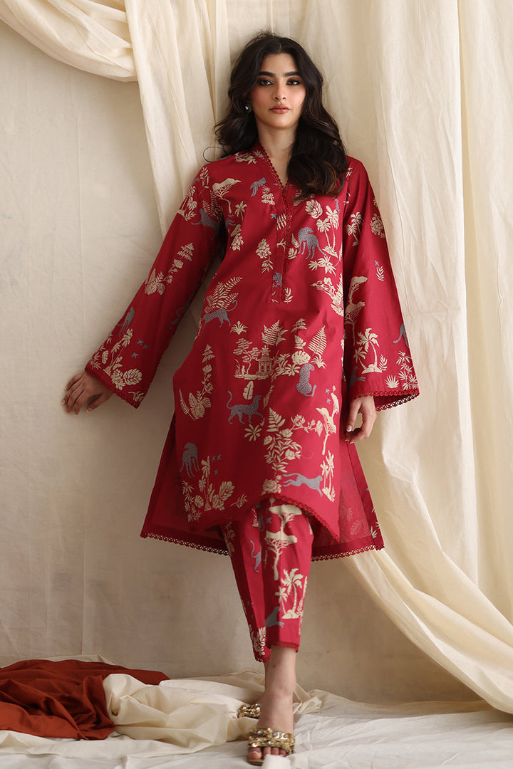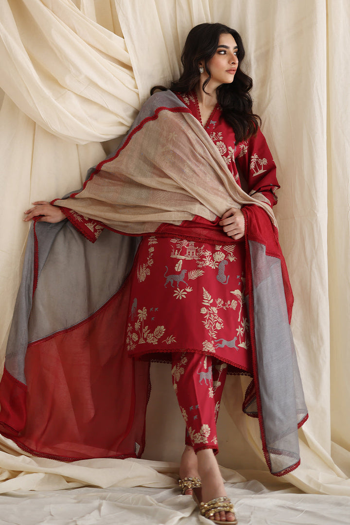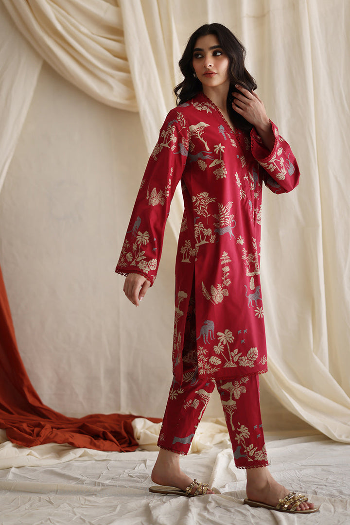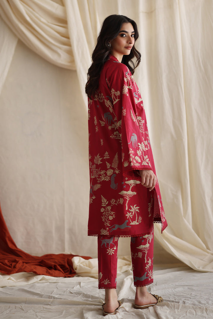 Reena, a breathtaking matching separate crafted from pure soft cotton in a stunning shade of red. This exquisite ensemble is a true standout, featuring a captivating screen print inspired by Chinese architecture.