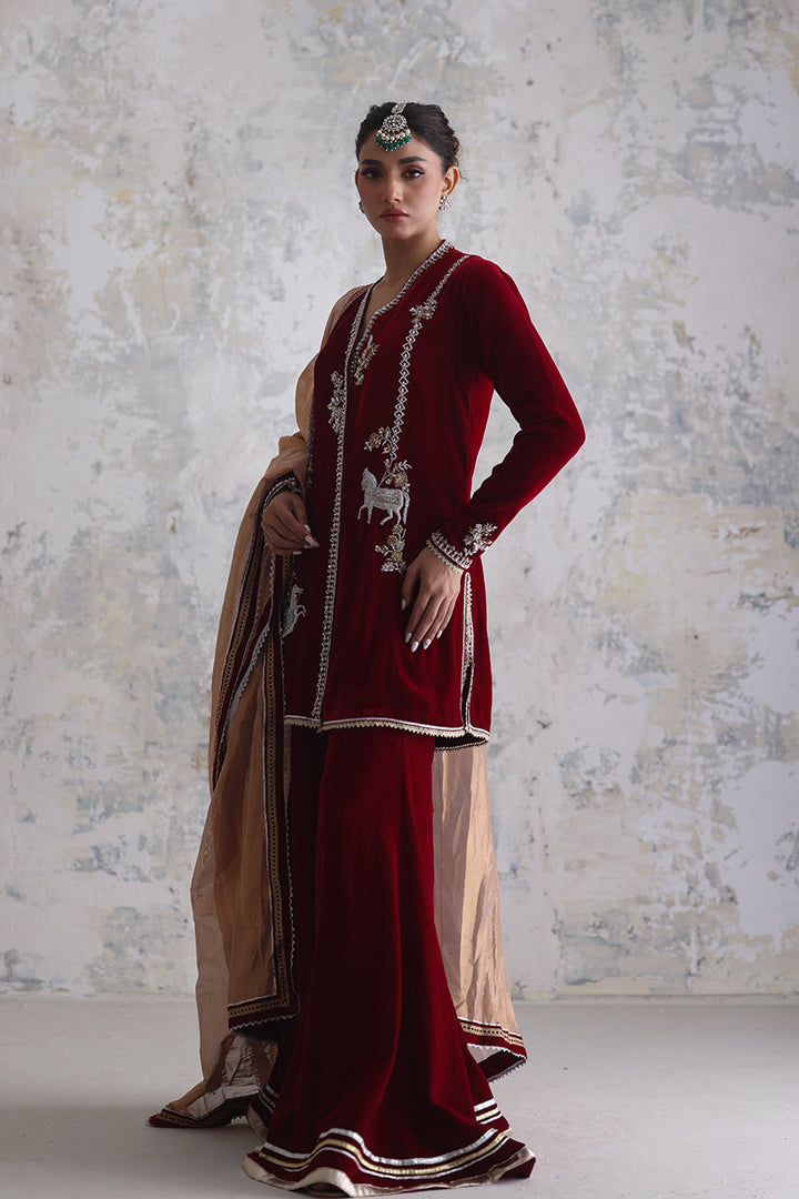 A study in regal poise, this maroon velvet aba draws from Mughal splendor while keeping its modern aesthetic intact. The short, A-line cut carries delicate handcrafted zardozi detailing in silver and gold, where ornate equine motifs intertwine with delicate geometries and floral tendrils across the length and sleeve hems. Sequins and beads lend a quiet radiance, white metallic gota and lace tracing the hem and sleeves add a glimmering frame. Paired with matching velvet dhaka pants, glistening with gota enriched hems, and an airy copper tissue silk dupatta bordered in matching velvet, gota, and trims, the ensemble finds balance between richness and refinement — tradition reinterpreted with measured grace.