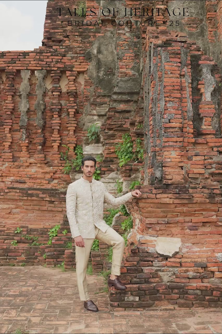 Designed for the modern man one who values restraint as much as grandeur. This prince coat in metallic silk holds a quiet brilliance, its off-white expanse softened with tonal white embroidery. Every motif is rendered in precision, offering richness without excess. Straight silk pants complete the look, its clean lines contrasting with the jacket s embroidered surface. A piece made for the muse who commands attention with subtle detail and uncompromising refinement.
