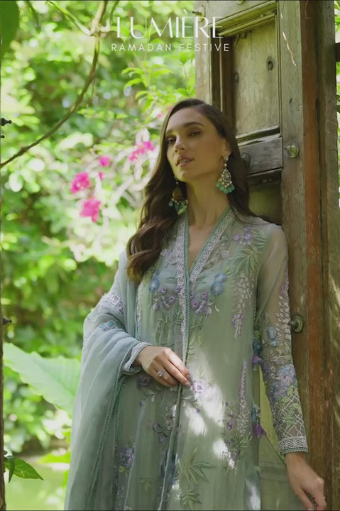 Soft sage organza becomes the canvas for a garden threaded in hues of purple, blue, green, and white, thriving across the length and sleeves of this chogha. At the placket, hem, and cuffs, geometric motifs ground the design, adding structure to the botanical ease. Handmade floral tassels add an unexpected surprise to the sides, swaying lightly with each step. Beneath, a crushed khaddi silk shift dress adds texture, its simplicity playing up the airy organza. The organza dupatta mirrors the chogha, embroidered in matching motifs and finished with tassels at the pallus, completing the story in balance.