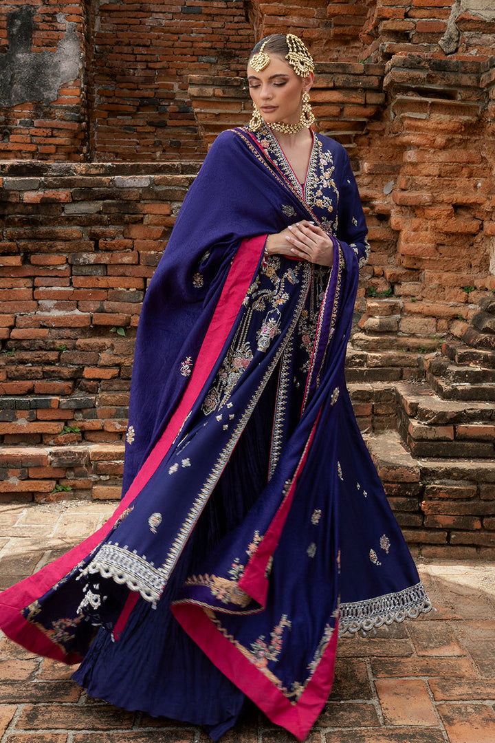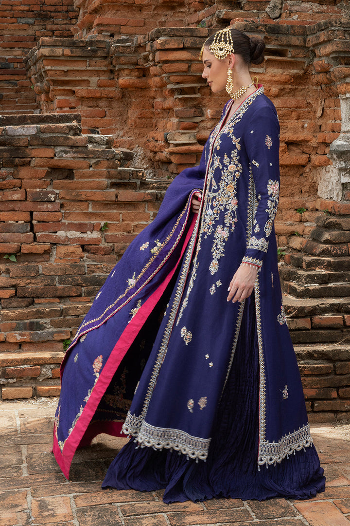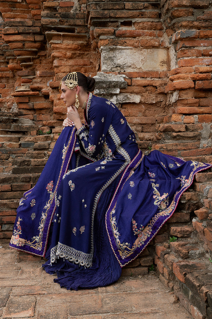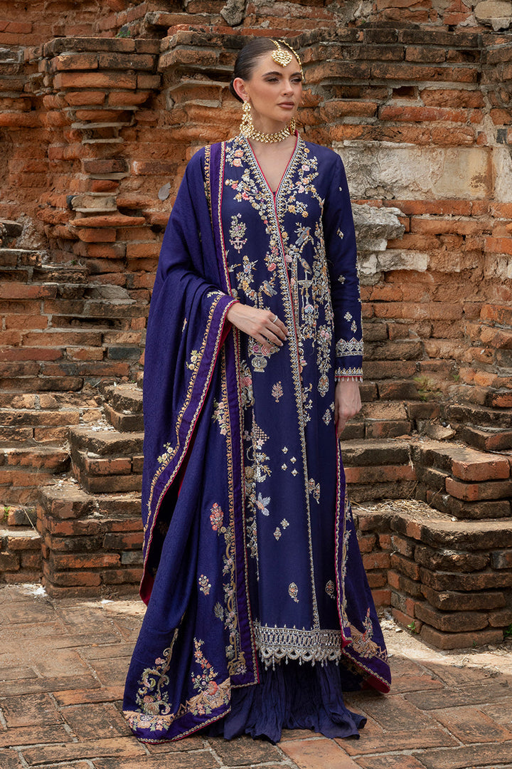 This chaddar celebrates the layered mastery of artisan embroidery. On a purple jamawar base, resham threads add vibrance, interwoven with silver and gold zardozi to bring depth and sheen. The dainty motifs are arranged with intention bolder forms around the pallus, finer details misted throughout the length. A border of lighter purple adds subtle contrast. The result is a piece that balances grandeur with restraint, rich in texture and artisanal detail.