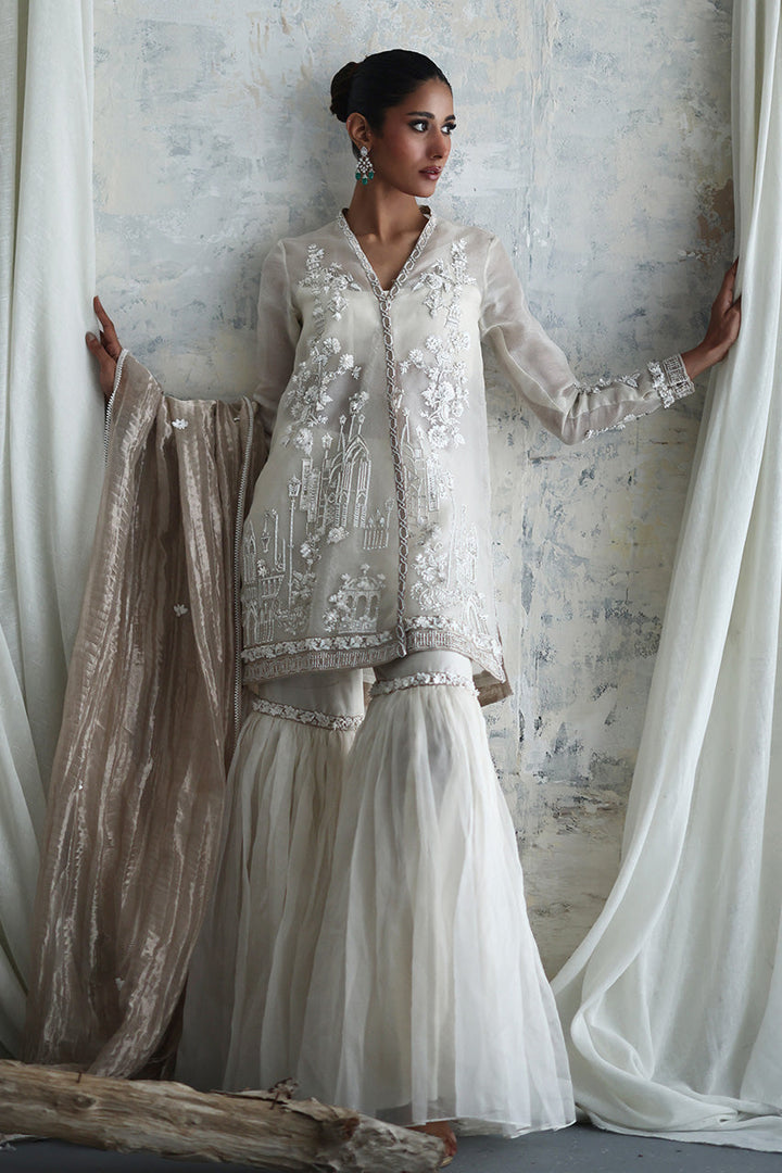 Sheer organza brings fluidity to this screen-printed chogha, where florals and Mughal-inspired motifs are elevated with hand-done embellishments that shimmer softly with movement. Paired with a matching gharara in an airy organza, sparkles with hints of matching detailing, the ensemble plays with transparency, light, and layered texture. A luminous gold dupatta adds polish with its handcrafted edging a refined choice for soft statements.