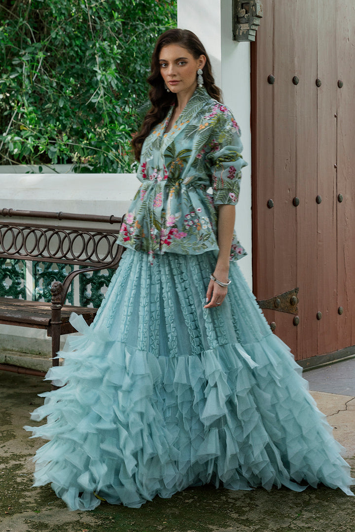 Sage organza catches the light like morning mist, its surface alive with embroidered tropical botanicals and avians. The peplum jacket is embroidered in a painter s palette verdant greens, sweet pinks, bursts of orange and red every inch worked to create a mesmerizing tableau. Lapels bring quiet structure, and the tasseled tie at the waist finishes it with an accented nod to craft. Beneath, the camisole in khadi silk offers a smooth tonal ground, letting the colors remain soft and luminous. Paired with a skirt that plays with texture; lines of ruffles fall from the waist, creating airy columns of dimension, before giving way to tiers of fringe and ruffles that add volume and swing to the flared silhouette. The result is an ensemble that turns a soft hue into a full composition of light and shadow.
