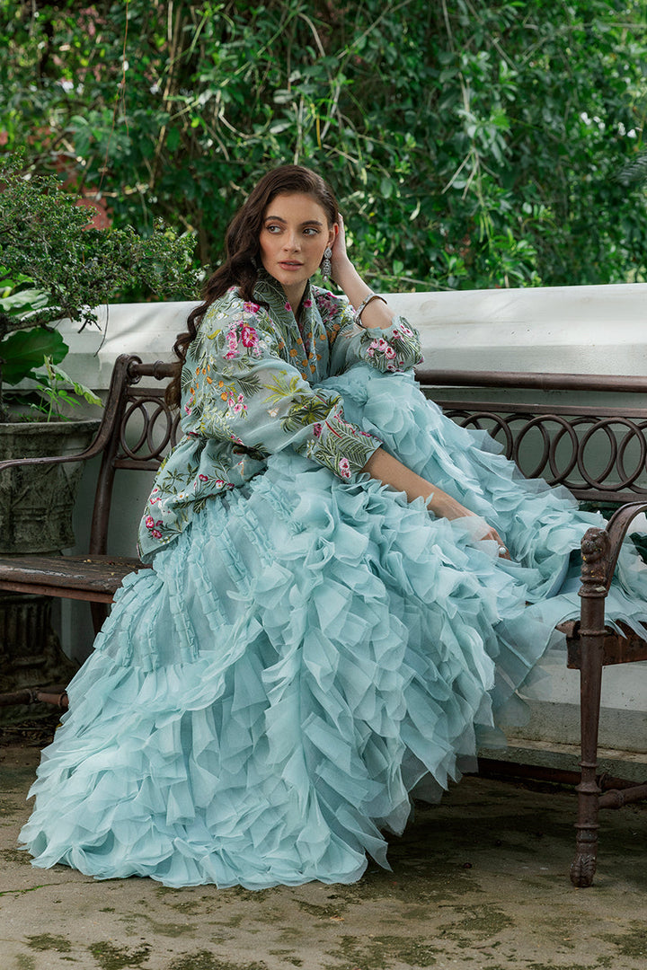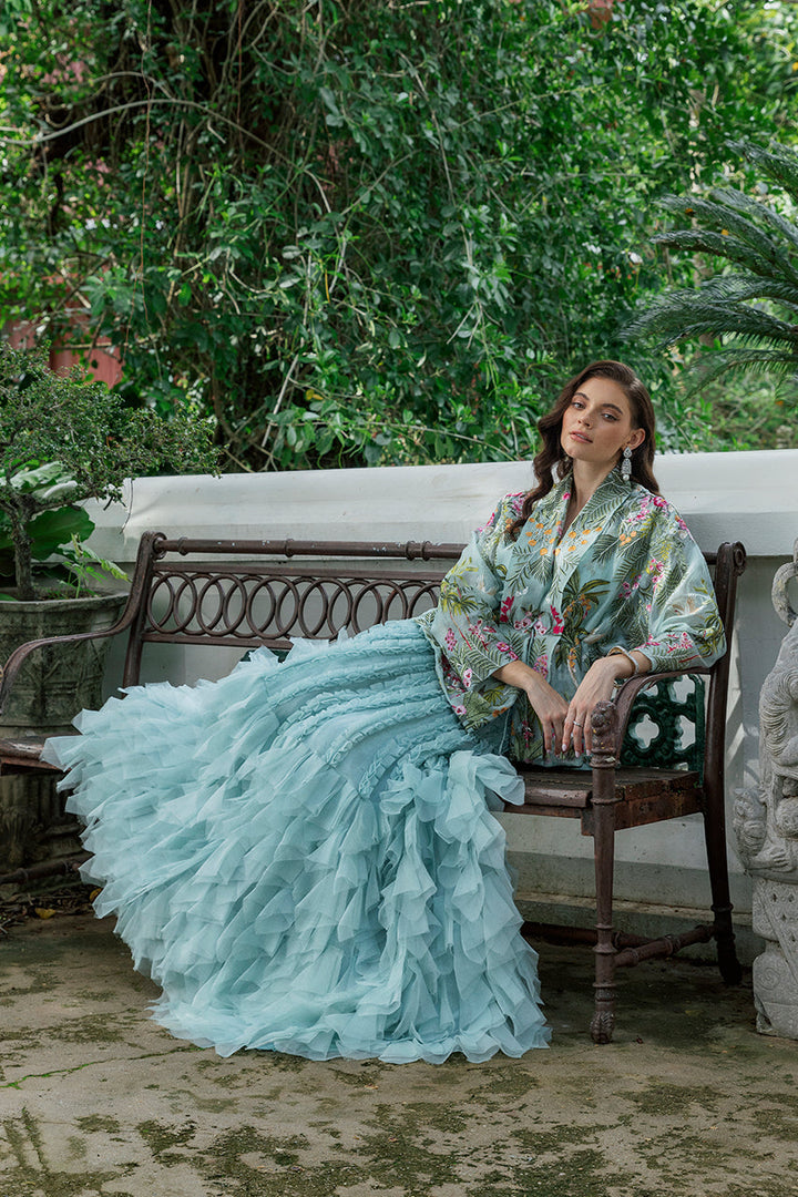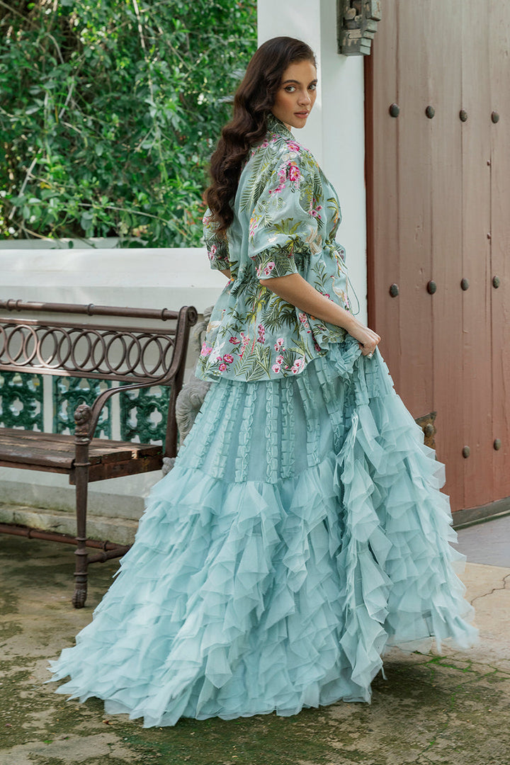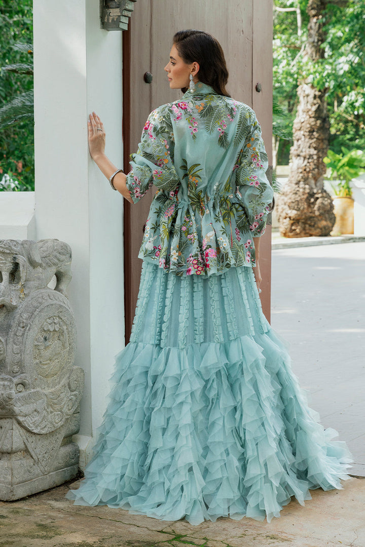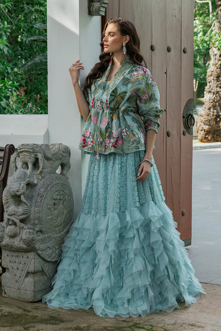 Sage organza catches the light like morning mist, its surface alive with embroidered tropical botanicals and avians. The peplum jacket is embroidered in a painter s palette verdant greens, sweet pinks, bursts of orange and red every inch worked to create a mesmerizing tableau. Lapels bring quiet structure, and the tasseled tie at the waist finishes it with an accented nod to craft. Beneath, the camisole in khadi silk offers a smooth tonal ground, letting the colors remain soft and luminous. Paired with a skirt that plays with texture; lines of ruffles fall from the waist, creating airy columns of dimension, before giving way to tiers of fringe and ruffles that add volume and swing to the flared silhouette. The result is an ensemble that turns a soft hue into a full composition of light and shadow.