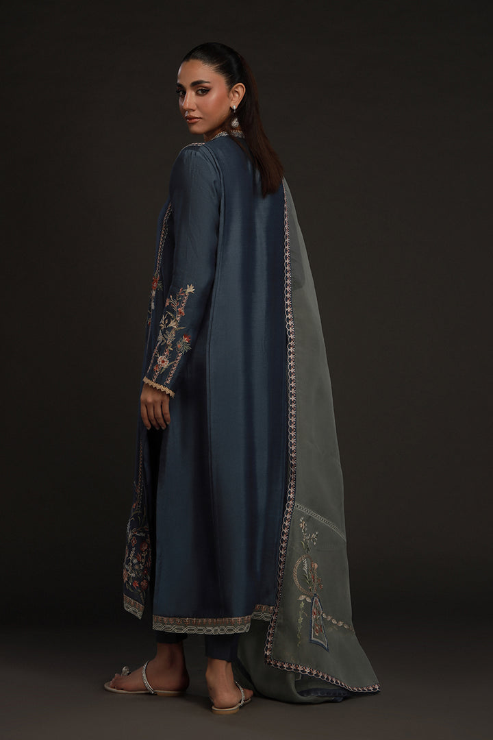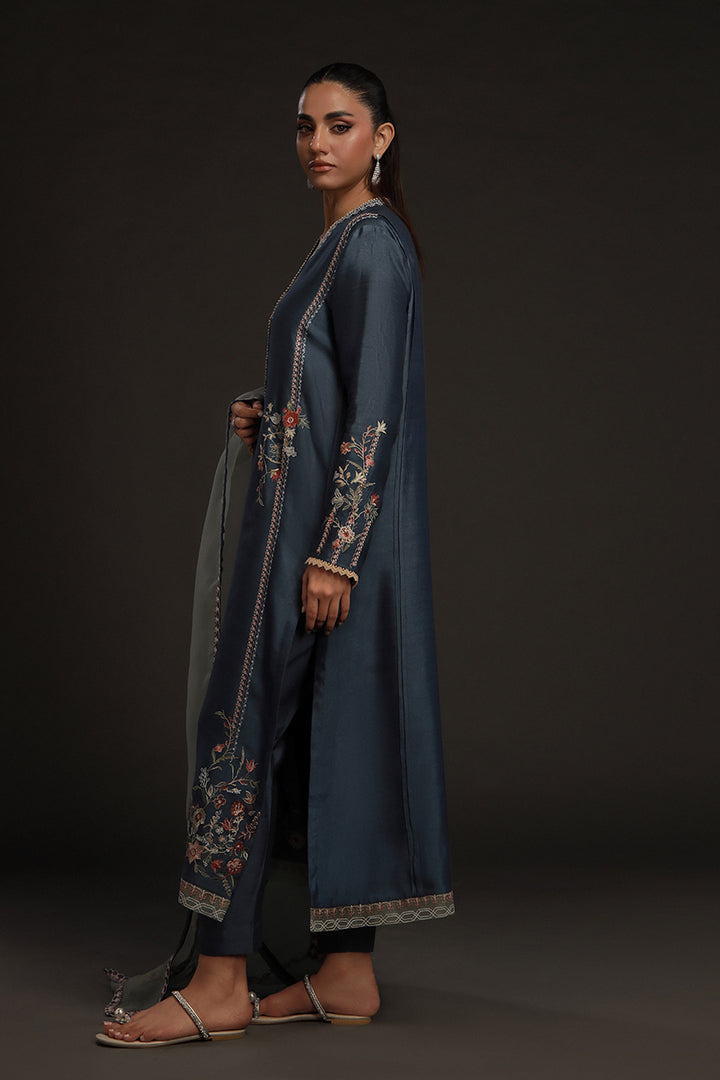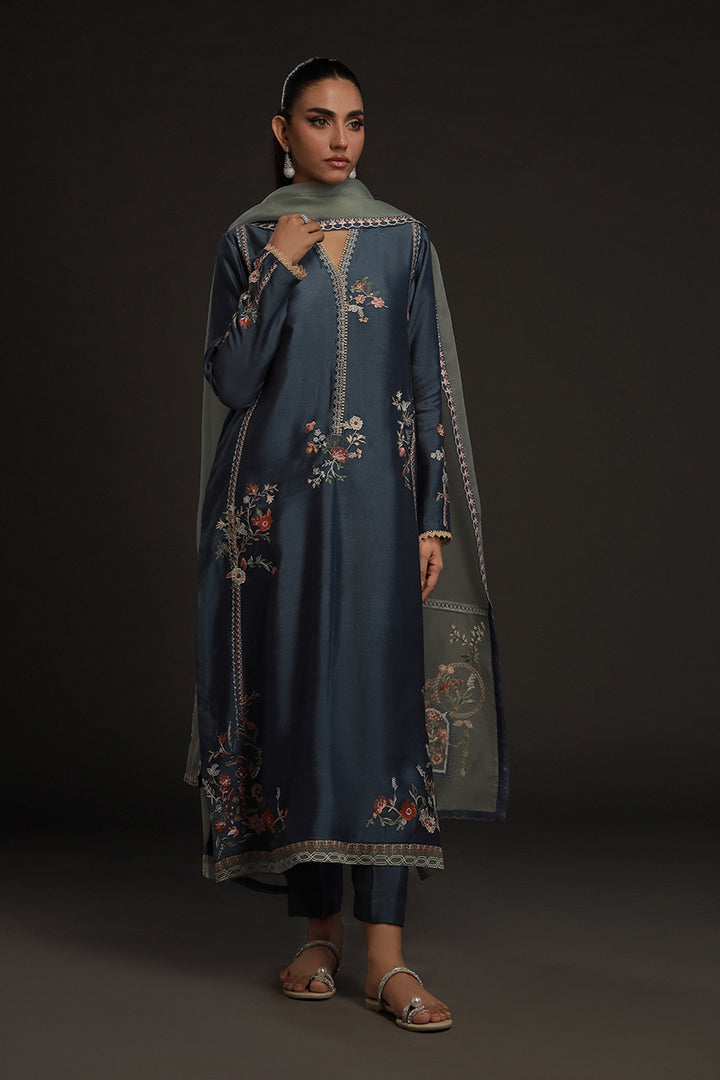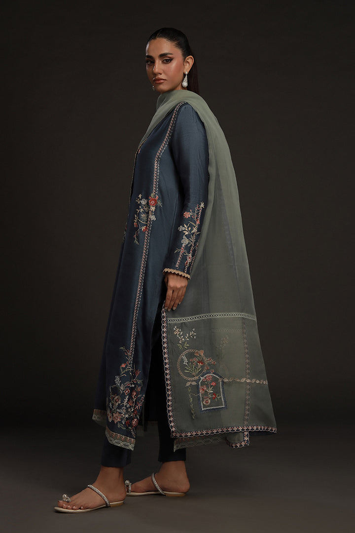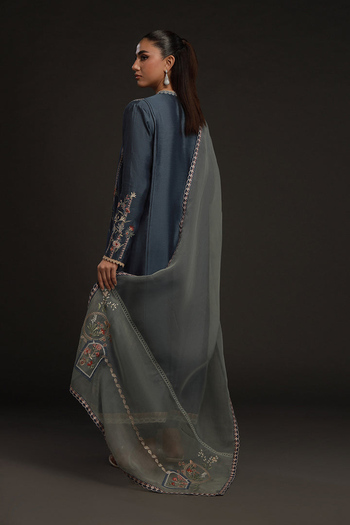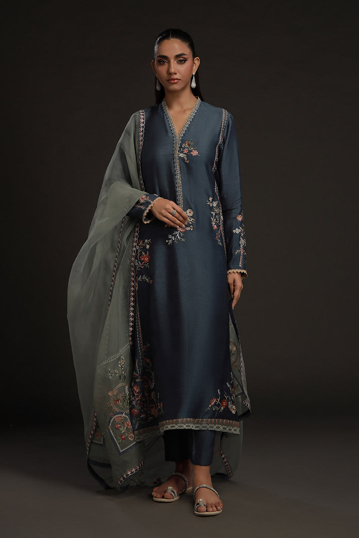 Understated but quietly striking, this look pairs a steely blue khaddi silk kurta with straight tonal pants for a column of calm color. Embroidery in soft beige and muted orange forms floral bouquets and geometric details along its length, neckline and hem subtle, deliberate, refined. The mint blue organza dupatta softens the look, adorned with florals and patterns in a matching palette. The result is poised and serene, a look that never feels overdone.