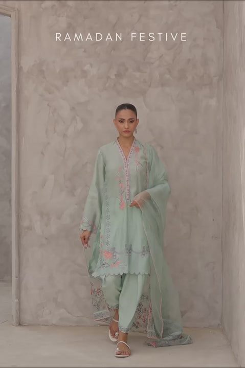 Delivery in 2-3 WeeksThis knee-length kameez, crafted from mint pure kora silk, carries florals touched with asymmetry. Embroidered blooms and patterns adorn the length, while lighter flourishes finish the sleeves. Intricate threadwork traces the neckline, finished with delicate scallops along the cuffs, hem, and side seams. A classic shalwar in matching pure kora silk, with embroidered hems, sits beneath. Completing the took, a mint organza dupatta floats lightly, its embroidered pallus perfectly tying in with the detailing across the ensemble. A refreshing composition that feels considered, light, and easy to wear.