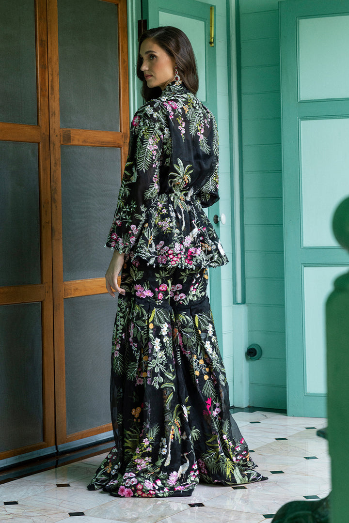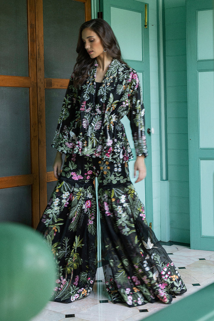 Color bursts against black, turning the sheer organza canvas into a tropical garden. Shades of green, pink, orange, red, and white weave together in lush harmony, evoking spring in full bloom. The peplum jacket is drenched in embroidery, its dimensional surface layered with hand-placed silver sequins and fine zardozi work. Shimmering sequined accents trace the hems and sleeves for a playful flourish. Beneath it, a solid khadi silk camisole provides a tonal anchor. The gharara continues the threadwork story with motifs flowing down from the waist and trailing up the voluminous hem, in a vivid crescendo. Together, the trio reads dramatic and deliberate a tropical vision refined for special evenings.