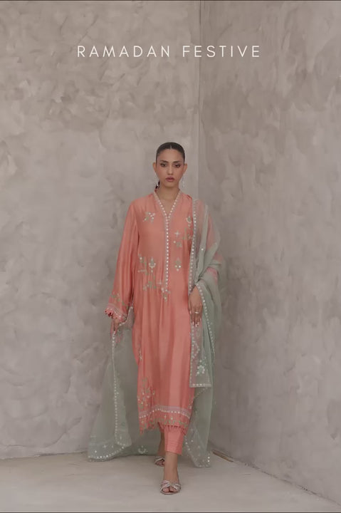 Delivery in 2 WeeksThis peach ensemble is a study in contrasts. The long kameez, rendered in kora, is embroidered with petite geometric florals that drift asymmetrically along the length, each layered with glistening foil accents. Borders of matching geometries adorn the sleeves and hem, finished with delicate fabric scallops and loops for a soft finish. Beneath, straight kora pants extend the peach form, gently pleated at the hems. Completing the look, a mint organza dupatta carries the same geometric asymmetry across its expanse and borders, matching the off-white and mint threadwork and accents. A considered play of contrast, elegance, and rhythm.