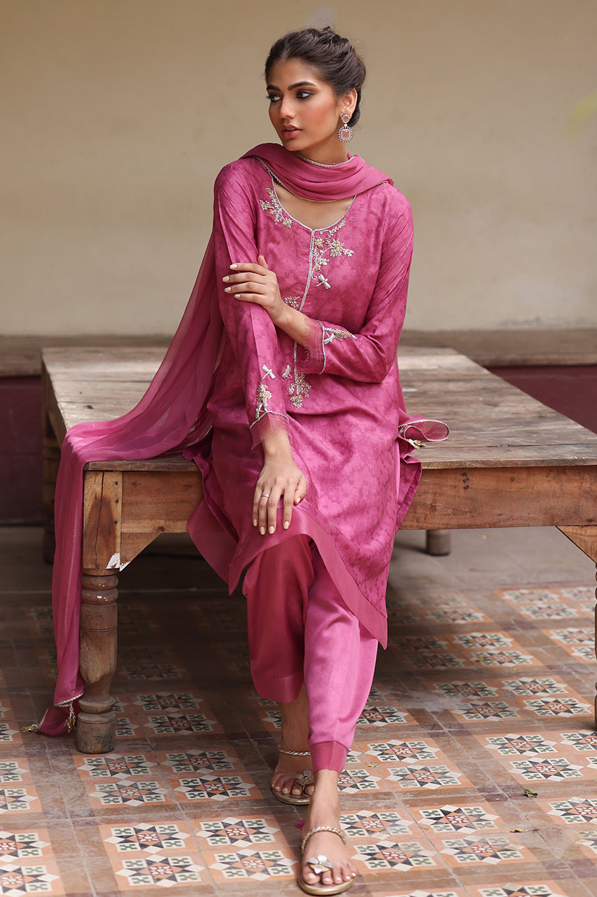 This semi-formal pink outfit is a blend of grace andelegance. The gold zardozi handwork on the purekhaddi jamawar silk kurta adds a touch of opulence.Paired with pure silk shalwar for comfort and a purechiffon dupatta for a delicate finish, this ensembleis perfect for those seeking a sophisticated yetrelaxed style statement.