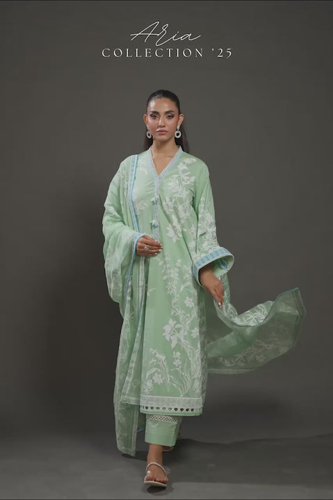This is a look that moves with ease and stays light on the senses. The cotton shirt, in a soothing green hue, flows long and straight, its surface traced with delicate screen-printed floral vines in white. Blue-edged neckline and sleeves break the monochrome palette, while handmade floral tassels on the placket add subtle movement. The matching izaar grounds the set with its subtle details, while the cotton net dupatta, screen-printed and bordered in blue, adds airy volume in movement.