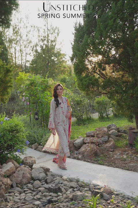 Summer elegance, rendered in almond premium lawn. Blooming tendrils and geometric motifs, embroidered in sunset hues and green, adorn the shirt’s fabric with a symmetrical rhythm. Delicately embroidered organza borders, for the hem and sleeves, lend lightness and definition. Paired with matching fabric for the lowers, with embroidered lawn borders and organza inserts, the composition is a thread worked symphony. Finished with a printed pure silk dupatta, the look drifts effortlessly between ease and refinement.