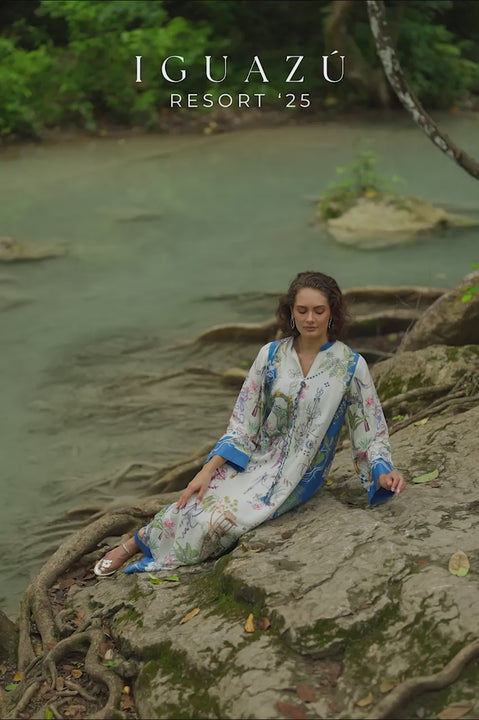 Effortless yet intricate, this silk kaftan carries easily from poolside lounging to evening gatherings. Whimsical printed motifs animate its body, while cool blue borders lend definition. The tassels at the bodice introduce a crafted note a touch of handwork that brings artisanal flourish to modern resort.