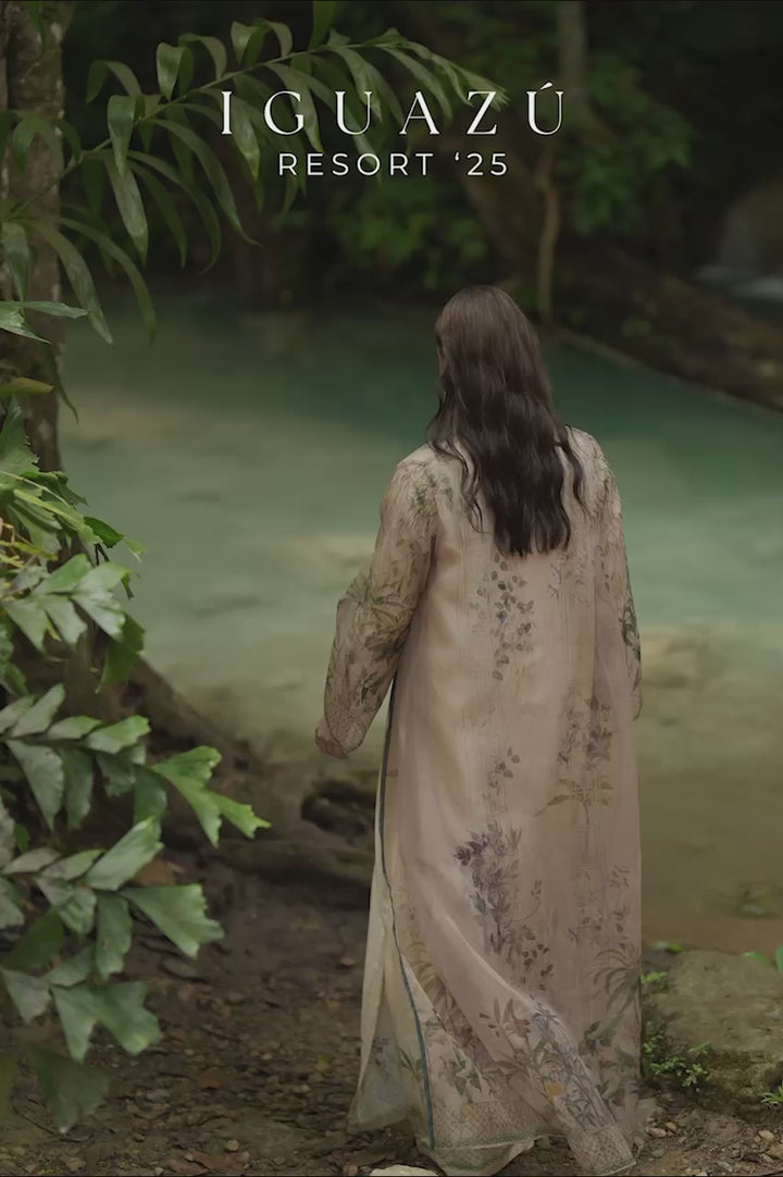 A quiet elegance runs through this cream kaftan. On its pure silk surface, green botanicals scatter delicately, lending color without overwhelming the base. The band collar leads into a tasseled placket, adding texture and movement to the clean A-line silhouette.