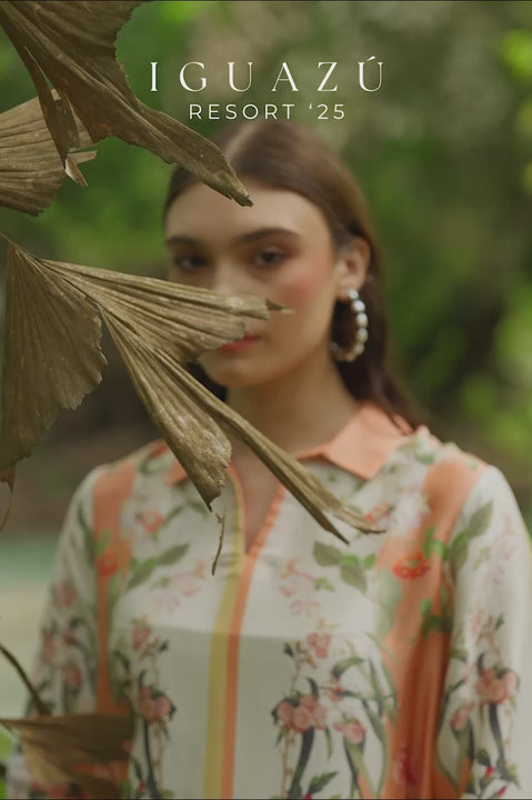 Crafted in pure silk for lightness and fall, this co-ord moves easily between shore and city. The collared shirt frames with ease while wide pants skim the length with refined comfort. Peach and white, interwoven with floral prints crossing boundaries like souvenirs of summer, carry the gentle rhythm of a resort escape.