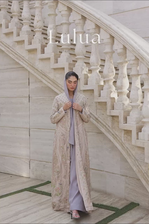 This ensemble reads like a quiet tableau. A floor-length A-line jacket in beige pure silk carries richly detailed scenes of a tranquil paradise — gardens framed by intricate geometric bands and winged creatures perched across the length and sleeves. Soft pastel hand-embroidery in resham, layered with delicate beadwork and touches of silver and white, brings the surface to life without disrupting its fluid fall. Grounding the narrative, a grey georgette kaftan and matching shella offer calm contrast, allowing the jacket’s story- driven handwork to remain the focus.