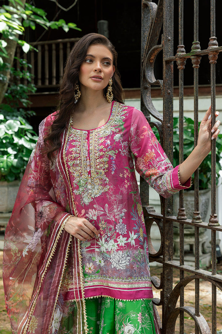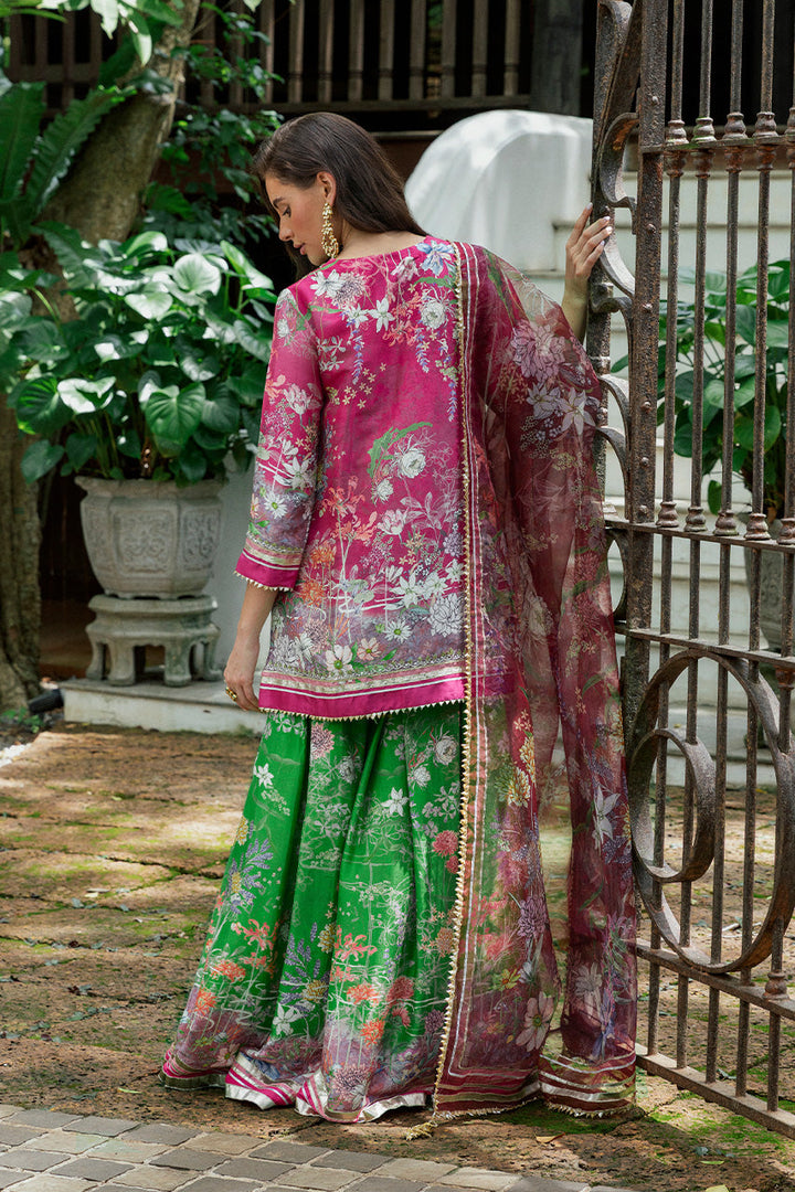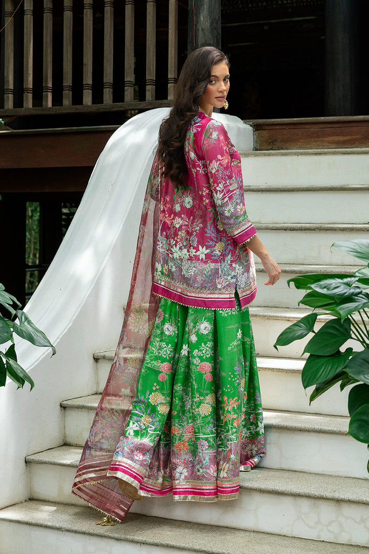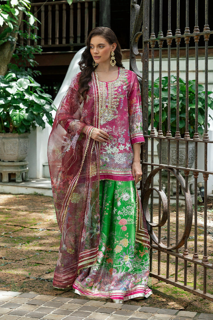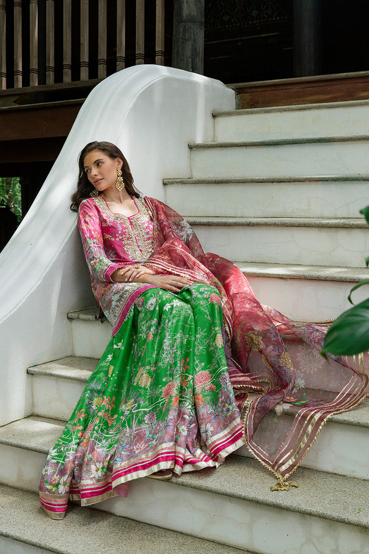 Festive in spirit, this ensemble reveals its grandness in motion. The bright pink khaddi silk kameez, alive with an abstract floral print, gathers brilliance at the neckline where silver and gold zardozi embroidery melds with sequins, beads, and gota. From the placket, crystal tassels swing, catching the light with subtle glimmer. Sleeves and hems carry delicate sequin and zari work, finished with gota trims. In contrast, the parrot green khaddi silk gharara unfurls with dramatic sweep, its matching print accented with gota edging that gleams with each step. Completing the rhythm, an organza dupatta hovers lightly in sheer pink, similarly patterned and framed with gota borders and tasseled corners. Together, this look is a festive harmony of color, craft, and cut.